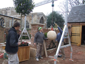 The terrace and courtyard in front of the house have been redesigned with help from Bunny Guinness. In 2007 we finally obtained planning permission and resources to demolish a dreadful 1950s garage. It has been replaced with something much more in keeping with the setting adjacent to St Andrew’s Church, along with a small ‘gothic’ orangery and a new terrace, formal garden and pool. To commemorate the bureaucratic nightmare of listed building consent, the new garage bears a small lead plaque identifying it as ‘An English Listed Building’. Which, despite being new, technically it is, because it is in the ‘curitlage’ of the listed house.
