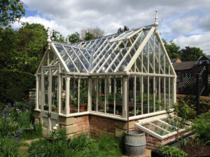 In 2015-16 we added a Victorain-style greenhouse in the orchard, which we built ourselves. See under ‘New for 2016’. (Cutting those curved edges for the panes of glass in the roof is actually easier than you’d think – I didn’t break a single one!).