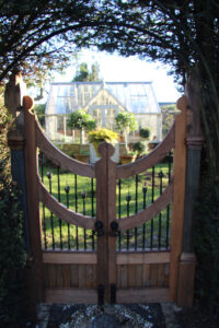 Gates to the orchard / hen runs and the greenhouse beyond.