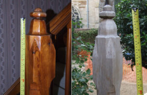 Much of the woodwork in the garden has details that follow the designs of woodwork in the house, such as this newel post in the Victorian staircase (left)