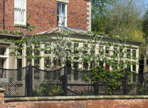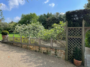 Decorative trellis separating the Terrace from the drive. A recent addition so no summer photographs yet. Also one of the oak Oxford planters.